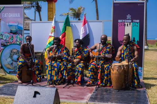 Highlife music and dance is a popular form of musical expression and storytelling known for its lively rhythms, lyrics and strong connection to everyday life. It features a mix of instruments, including guitars, horns, drums, xylophones and percussion. The music is often built around call-and-response singing, with the lead singer echoed by a chorus of backup singers, and is performed in many local languages, as well as in English and Pidgin. It is performed during weddings, funerals, festivals and naming ceremonies, often with lyrics that reflect current social issues such as health, education, relationships and social norms and challenges.