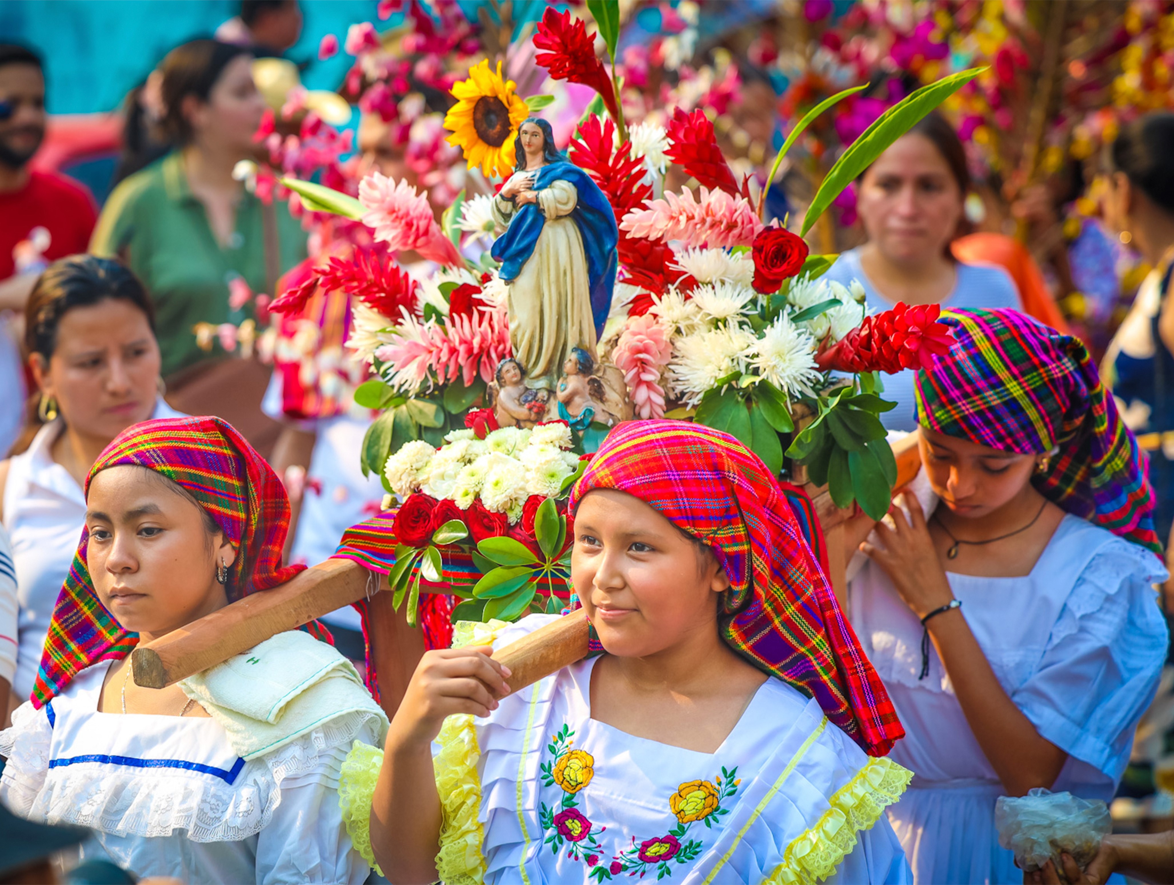 Title EN: Anda bearers transporting the image of the Virgen de la Concentión, dressed in traditional attire, the 'paño pancho' covering their heads is woven on a backstrap loom using ancestral techniques and its pattern and color combinations are unique to Panchimalco
