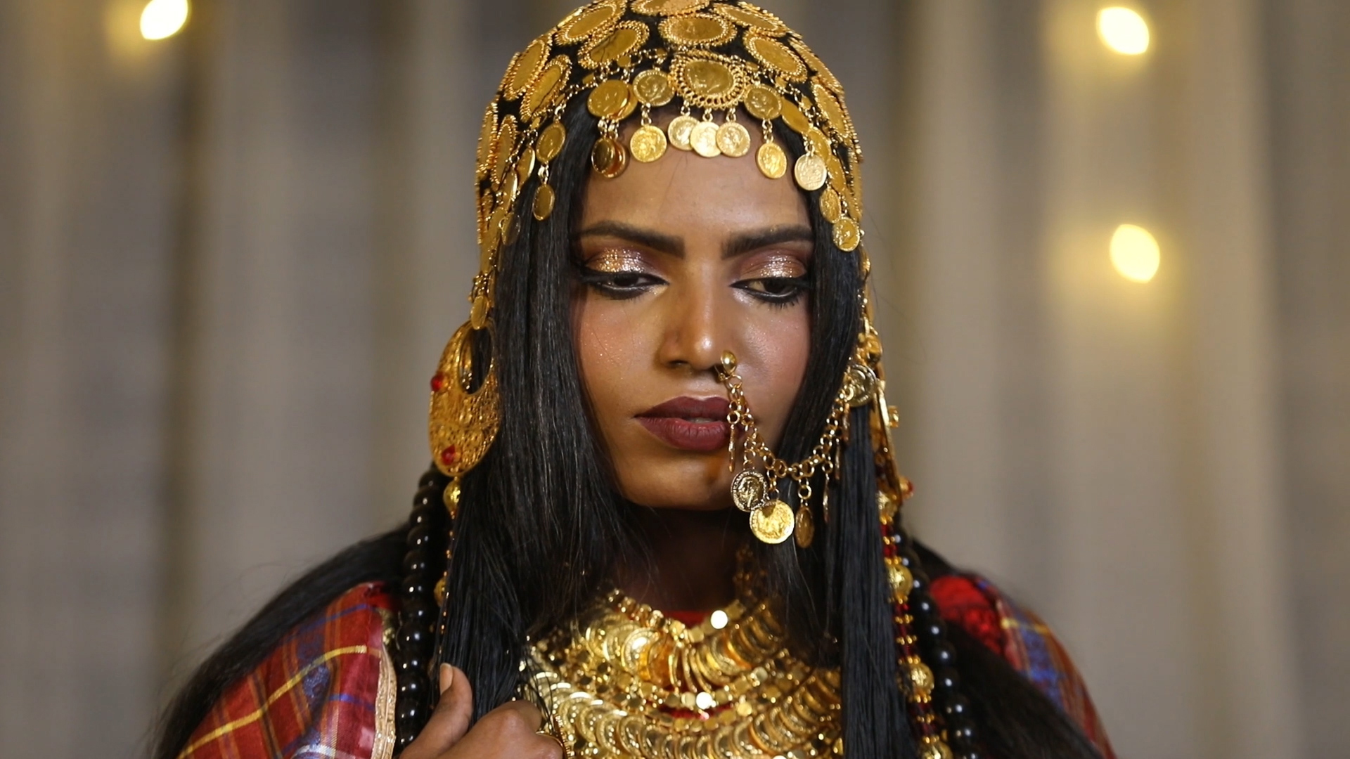 Title EN: The jewelry of silver and gold: The bride adorns herself with abundant silver and gold jewellery passed through generations during al-Jertig ceremonies. Beyond enhancing her beauty, these pieces symbolize prestige, wealth, and nobility, serving primarily to ward off the evil eye, envy, and malevolent forces, thus ensuring protection against harm.