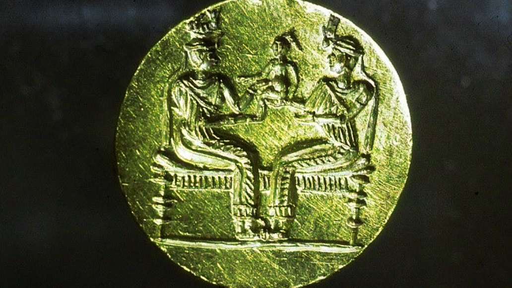 Title EN: An image of a ritual showing the gods blessing the king and queen seated in a posture resembling al-Jertiq. Such scenes are depicted in inscriptions on the walls of the Temple of the Sun, in the Yellow Musawwarat, and in Naqa'a, from the Kingdom of Meroë (from 300 BC to 350 AD).