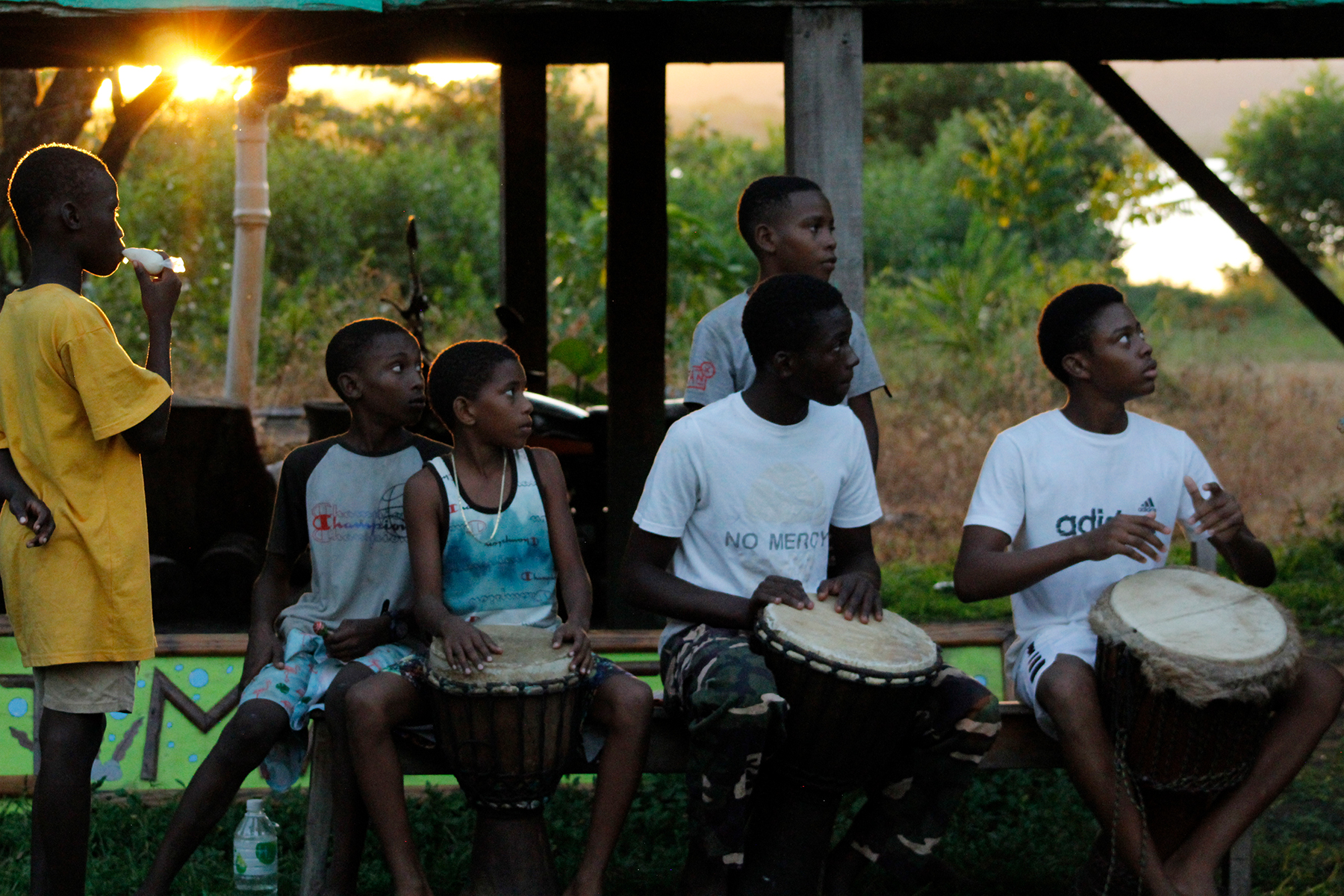 Title EN: This image highlights the continuity present in the community. The youths shown in the pictures are students enrolled in the drumming school in the Gales Point Manatee community.