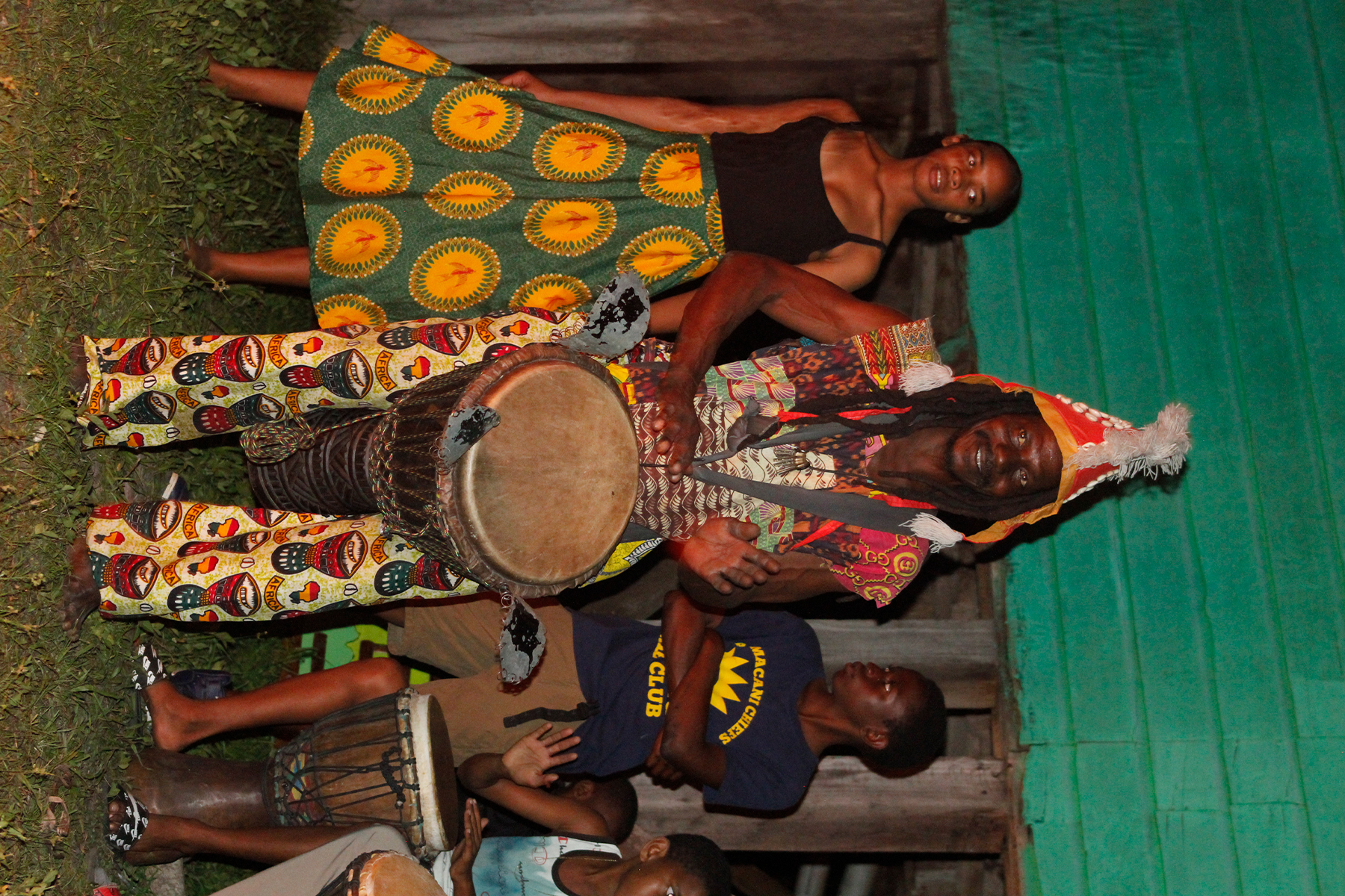 Title EN: This image highlights the lead drummer in the Gales Point Manatee community. He is dressed in traditional clothing associated with the Bram and Sambai, derived from West Africa.