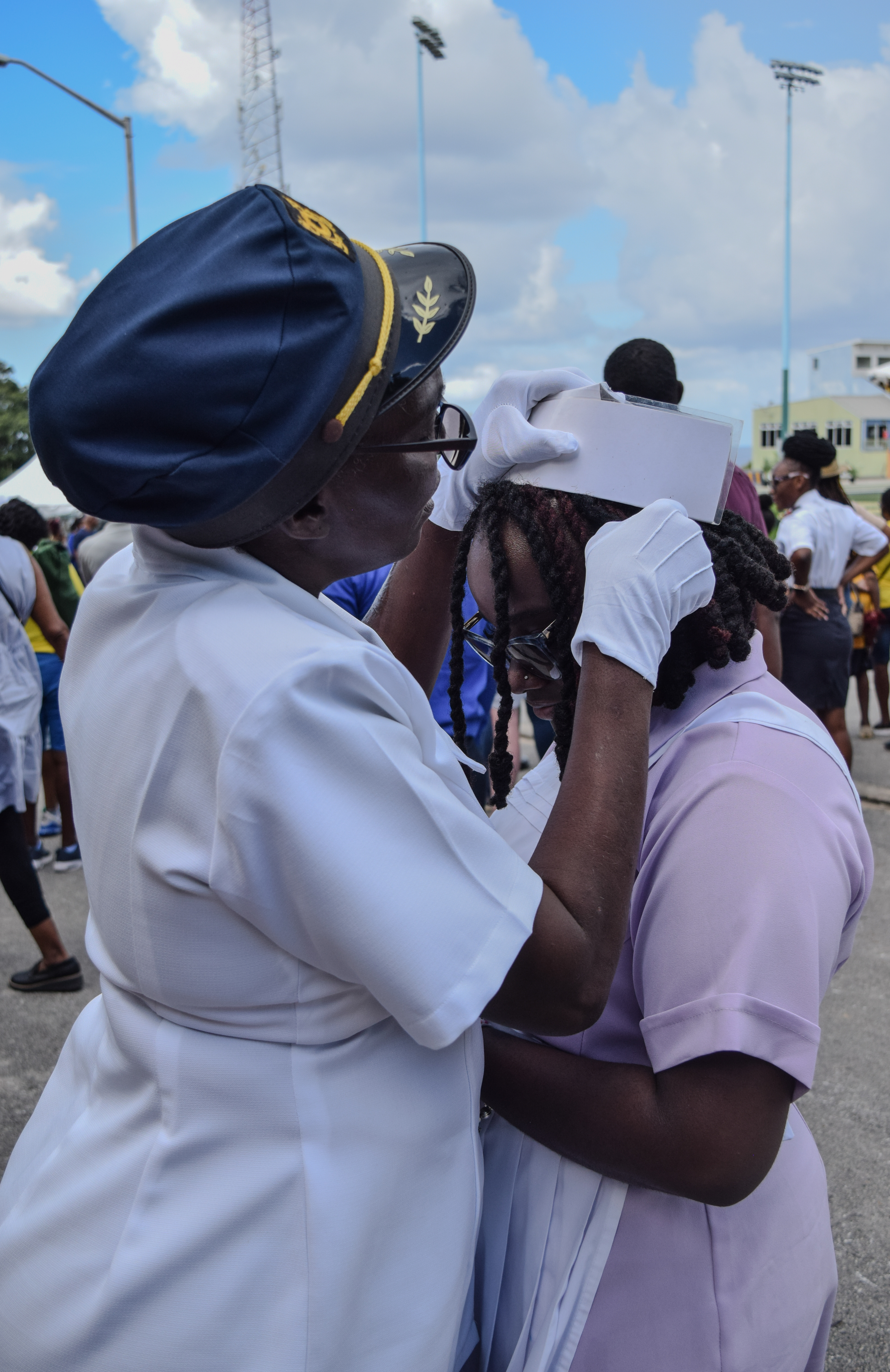 Title EN: Right Marker, Telma Alleyne, assisting Nurse Aleah Burgess, both members of the Barbados Landship Association, with her head dress.