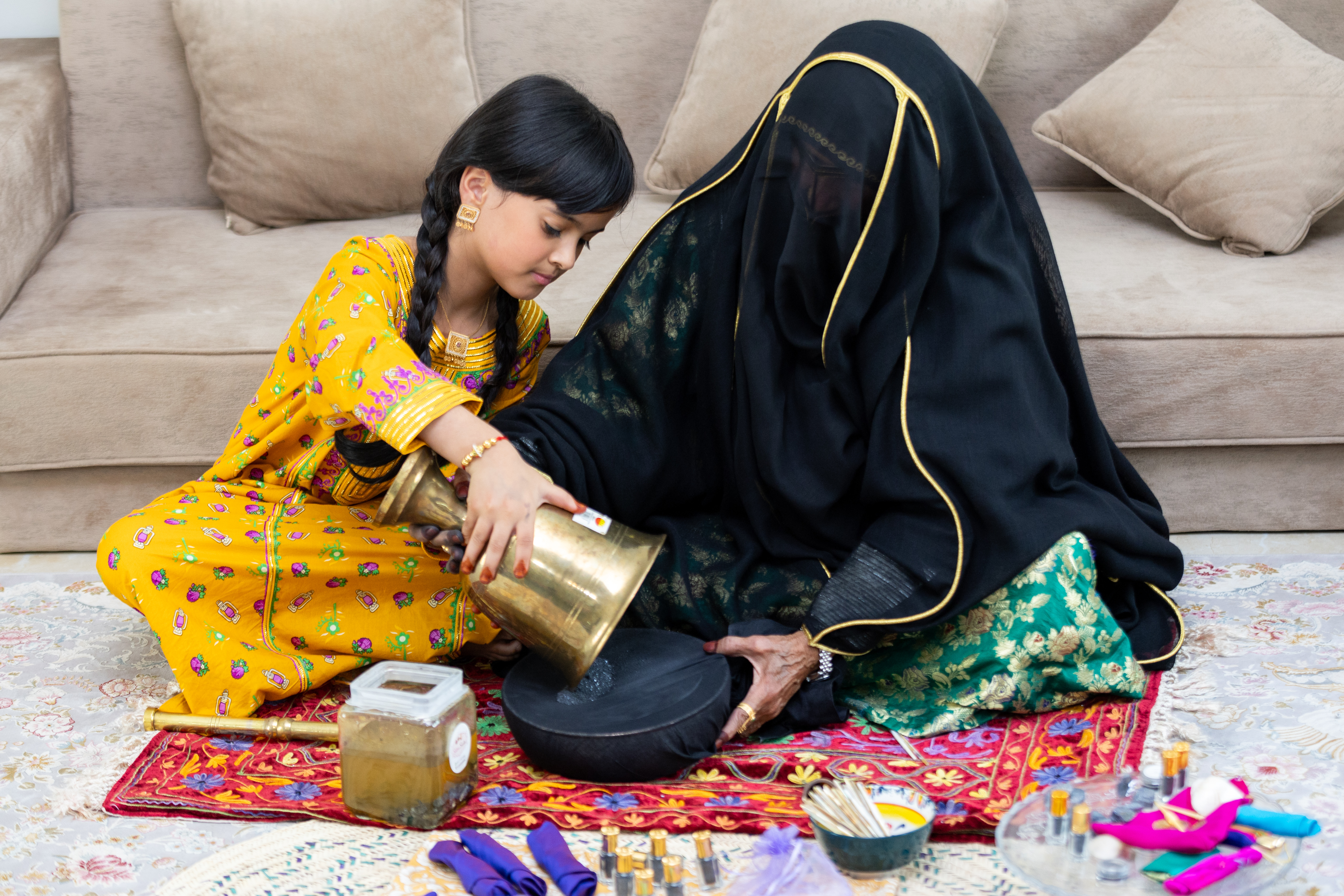 Title EN: An experienced artisan transfers her knowledge on Kohl making to the little girl during a workshop on Kohl-making