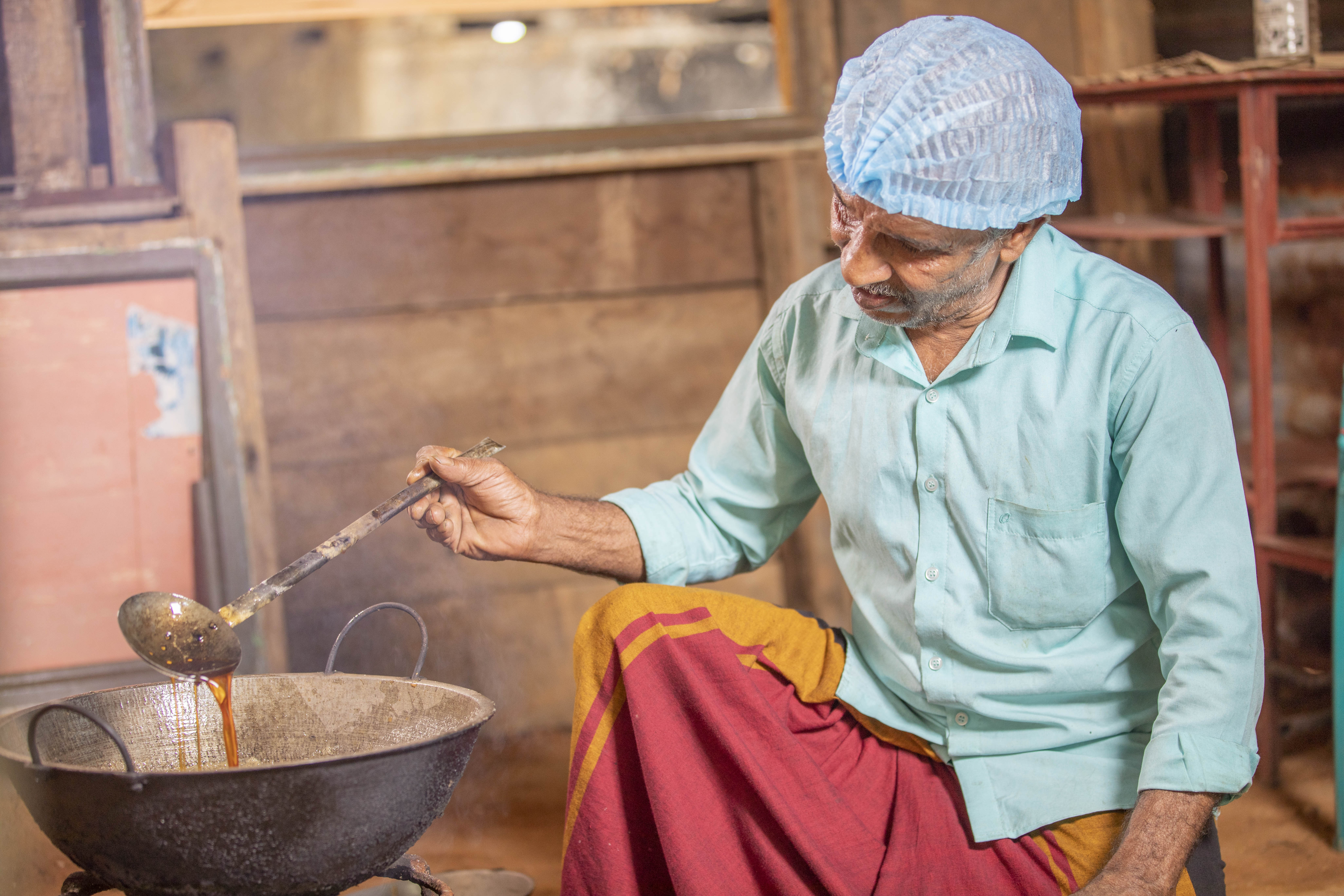 Title EN: Continued boiling of kithul sap with careful temperature monitoring ensures high-quality treacle without caramelization.