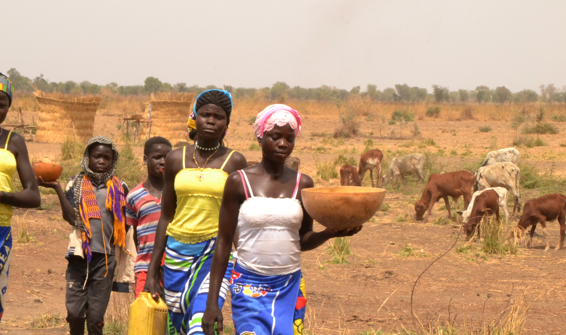 Título FR: Approvisionnement du GURUNA en couscous du Mil rouge. Des jeunes filles approvisionnent le campement du GURUNA en eau et couscous du mil rouge ou jaune. Ces éléments serviront pour le malaxage du couscous avec le lait.