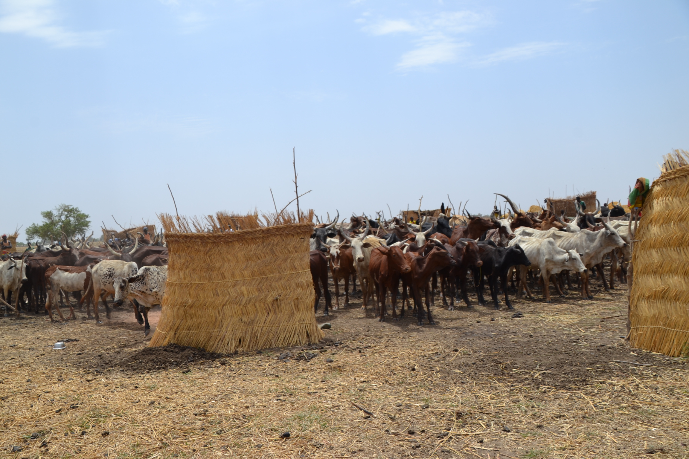 Titre FR : Campement du GURUNA avec les bétails. Le campement du GURUNA est le lieu où la symbiose entre les vaches et les hommes se manifeste. Les vaches sont au milieu et les pratiquants du GURUNA tout autour.