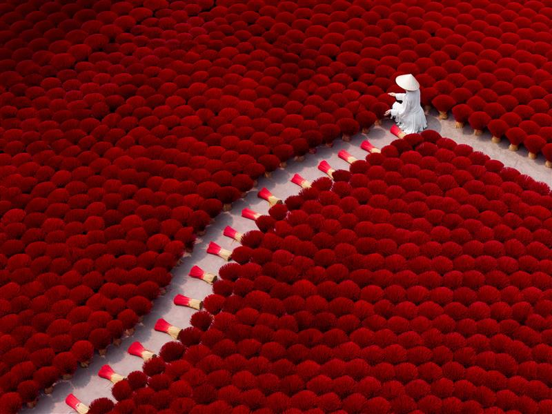 Titre FR : Encens vietnamien bâton de production tradition et couleur, femme de beauté en chapeau traditionnel.