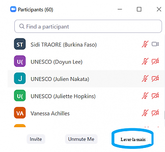 La main bleue levée signalera à la Présidente qu’un participant souhaite prendre la parole et celui-ci sera ajouté à la liste des intervenants. Lorsque la Présidente demande à un participant de prendre la parole, il devra remettre son micro en marche en cliquant sur le bouton du micro en bas à droite. Idéalement, si leur connexion Internet le permet, les participants doivent également utiliser leur vidéo. Une fois leur intervention terminée, les participants doivent remettre leur micro en sourdine afin d’éviter les bruits de fond.